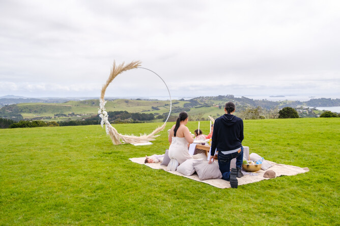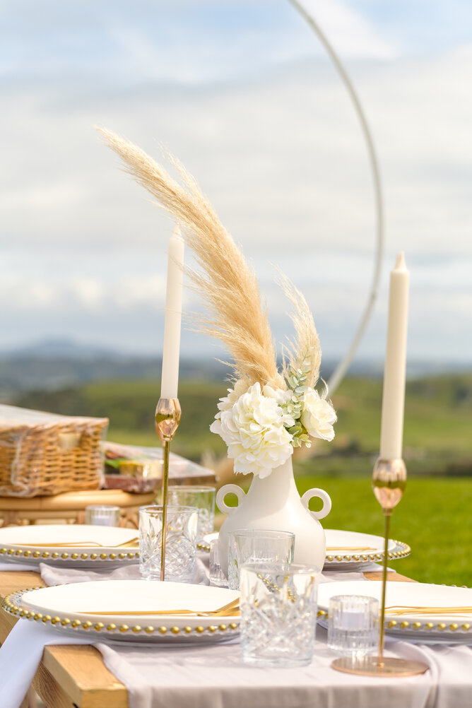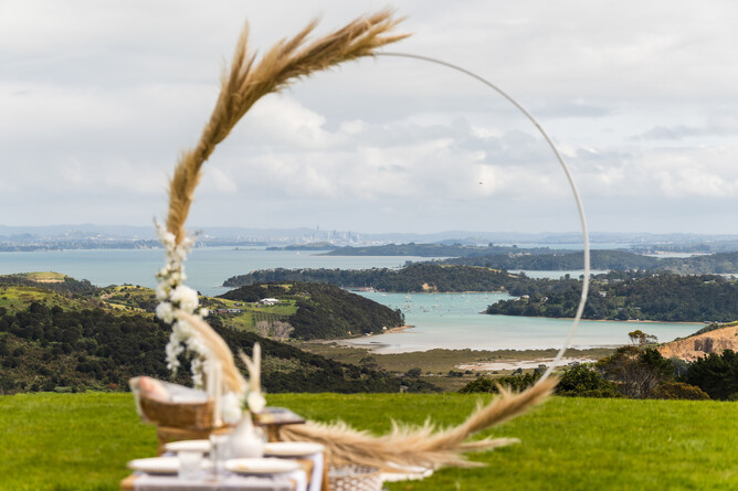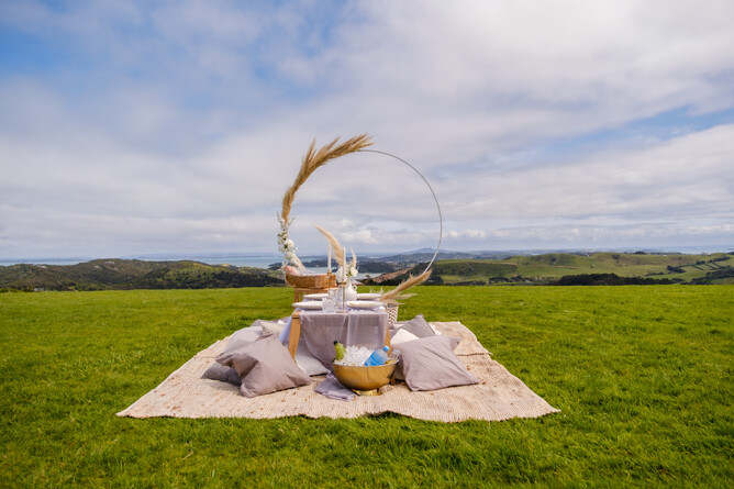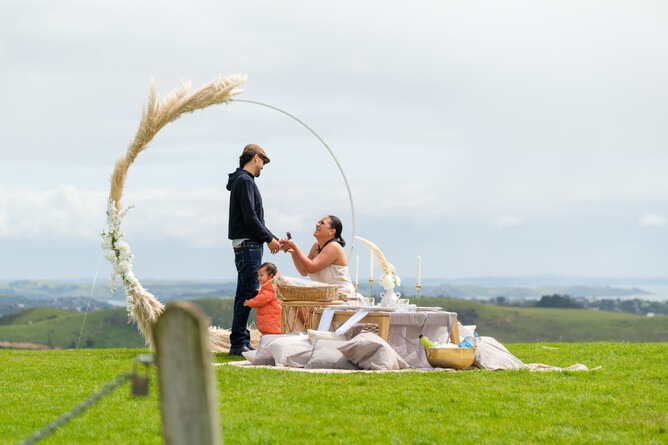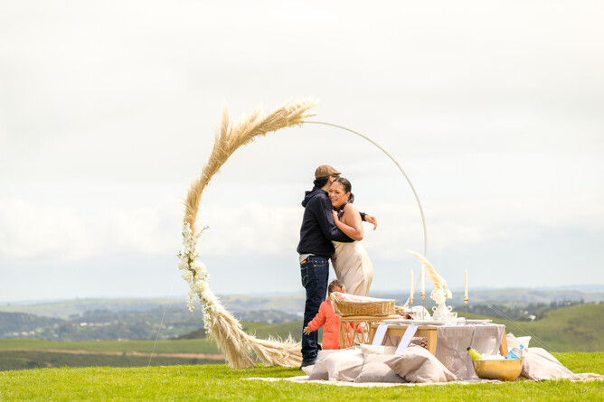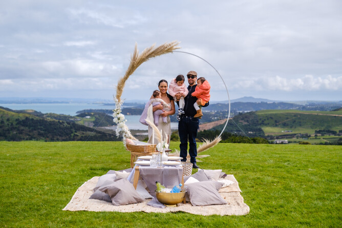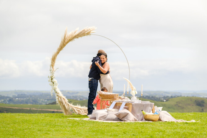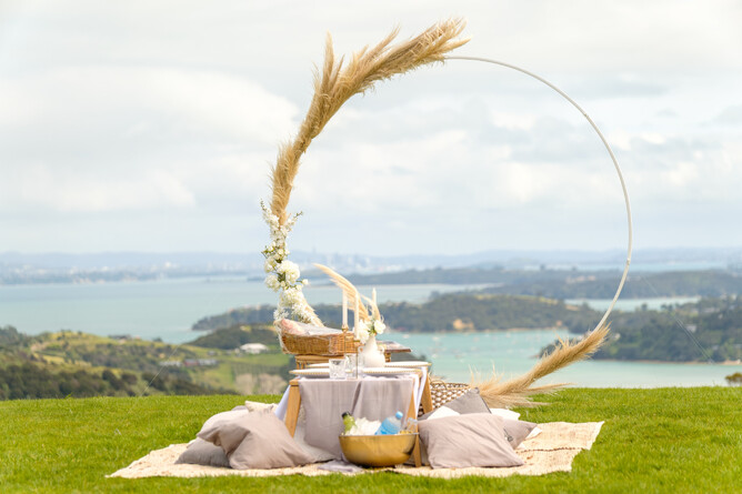 Tapaita approached us to let us know that she wanted to propose to her long term partner on Waiheke Island and that her dream was to include her children in their special moment. She specifically asked for neutral colours with an archway that would frame the beautiful island backgrounds. We recommended a hilltop lookout with a luxury picnic and a customised design. We brought in our favourite photographer and set the scene for her so that she could just turn up and enjoy the moment. Gene was surprised but said YES, yay! Another happy couple!