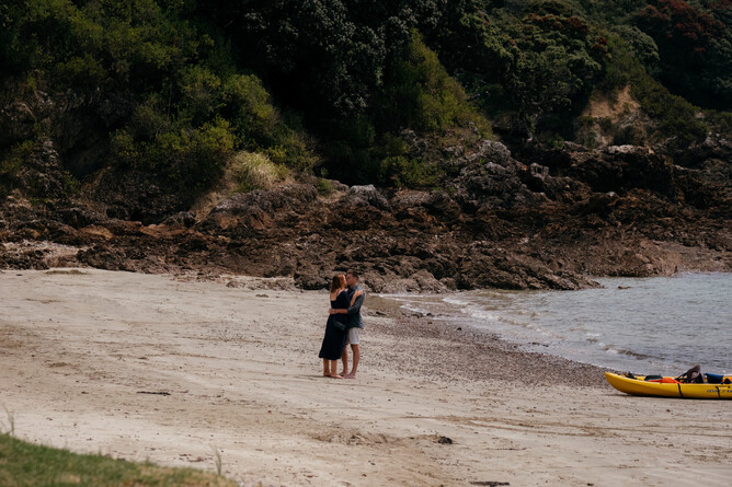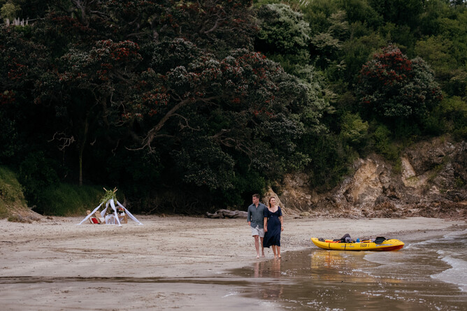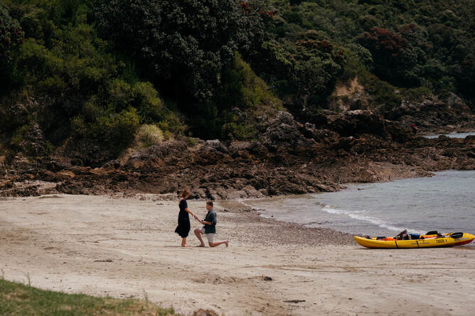 Sam reached out to us a few months before he was planning to propose with an interest in booking one of our proposal packages. Heading to Waiheke Island from Auckland on a ferry, Julia has no idea that when Sam suggested a beach walk that she'd be surprised with a kayak excursion. Our discreet instructor sent them out on the water, guiding them to a nearby beach that Sam had chosen for his proposal location. On the way, they were able to see caves, clear blue waters and coral.