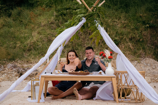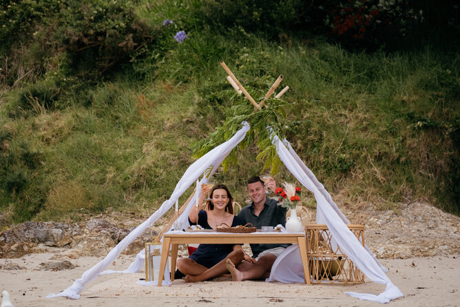 As they neared the shoreline, Julia spots the picnic set up. They hop off their kayak and Sam proposes, of course she said yes! To celebrate, they settled into their luxury picnic with champagne and a gourmet platter, taking in the views of beautiful Waiheke.