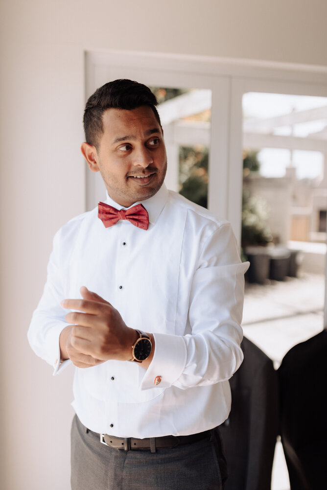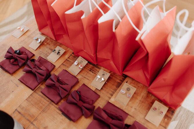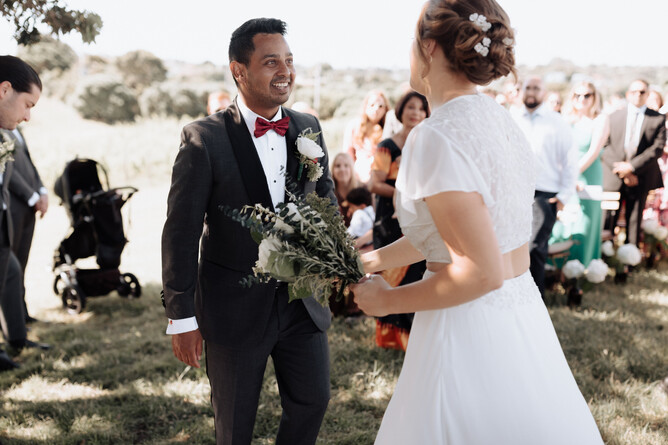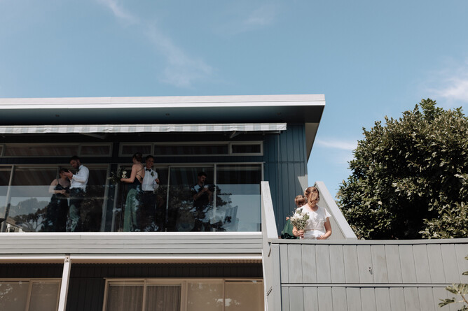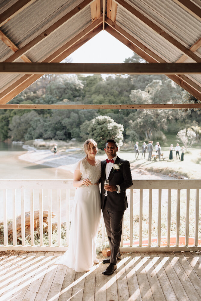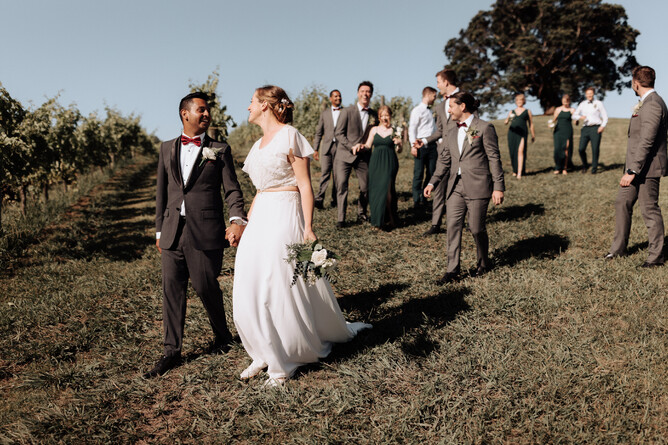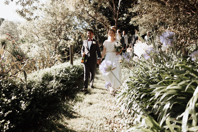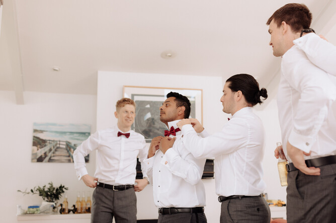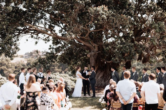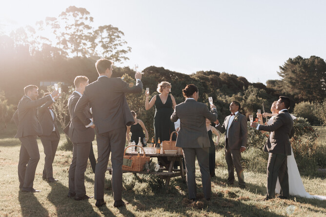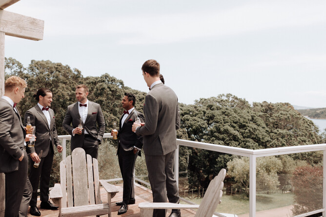 Venue: Goldie Estate | Photo/Video : Hollow and Co. | Wedding Dress: Anthropologie | Bridesmaids dresses: Park and Fifth Co. | Groom Suit: Indochino | Groomsmen Suits: Barkers | Bow Ties and pocket squares: Otaa | Hair and makeup: The Peach Club (bride and bride maids) | Barber: Aneia Warner Salon | Flowers: Bride's mother | Hire: Indigo Waiheke | Rings: Culet jewelry | Cake: Moustache Cookie