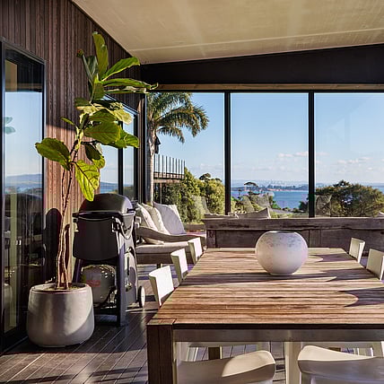 Two Bedroom Lodge This modern property has spectacular views overlooking Church Bay back to Auckland City with views across the Hauraki Gulf and Rangitoto.